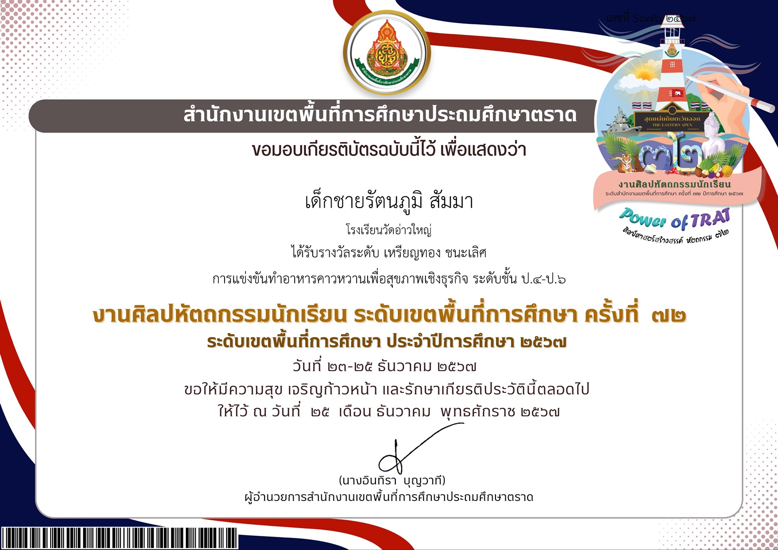 รางวัลระดับ เหรียญทอง ชนะเลิศ การแข่งขันทำอาหารคาวหวานเพื่อสุขภาพเชิงธุรกิจ ระดับชั้น ป.4-6